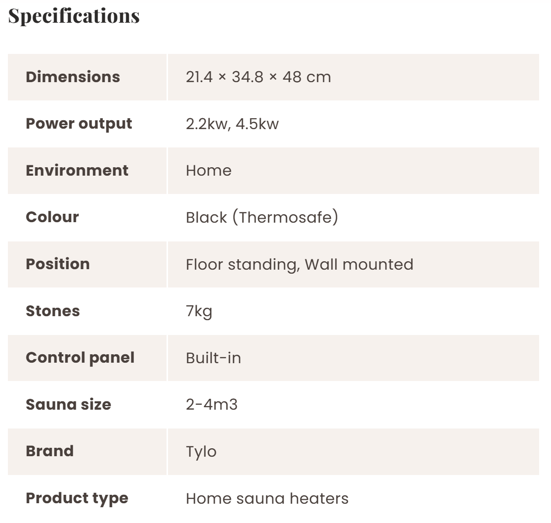 Additional features include divided output functionality and deep stone compartment for greater steam. The long-lasting heating elements and raft of built-in safety features make it perfect for home sauna use.
